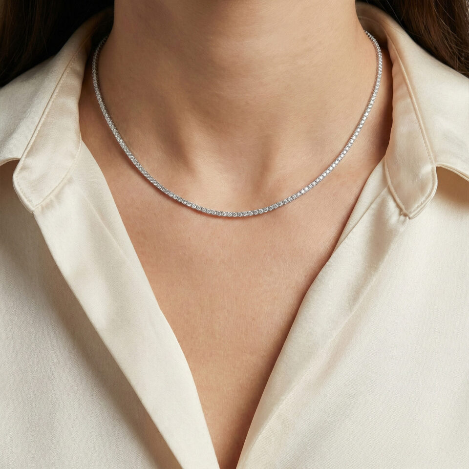 تألقي بأناقة استثنائية مع عقد ذهب ابيض مصنوع من الذهب الأبيض عيار 18 قيراط، تصميم راقٍ يجمع بين البساطة والفخامة ليمنحكِ إطلالة مثالية في أهم لحظات حياتكِ.