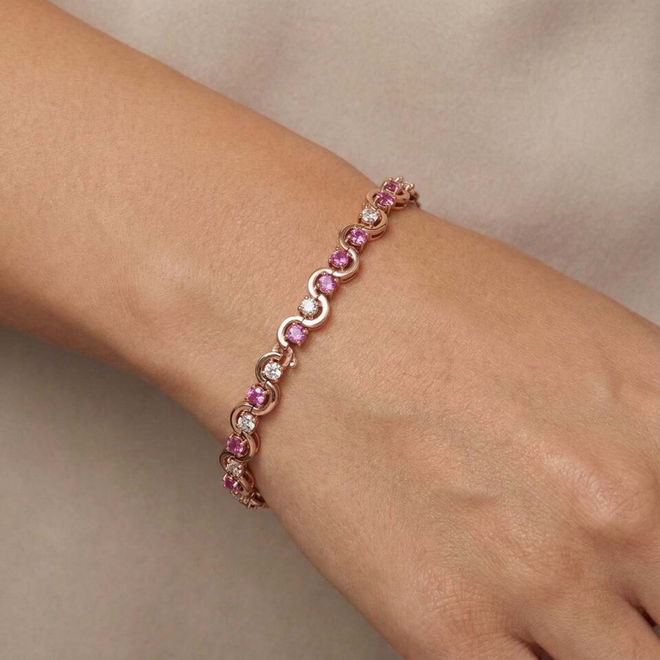 امنحي معصمك بريقًا لا يُقاوم مع هذه القطعة الفاخرة التي تجمع بين الأناقة والتميّز. اسوارة الماس من متجر فتيحي من الذهب الوردي مع الألماس والياقوت هي الاختيار الأمثل لكل امرأة تبحث عن الفخامة الهادئة والإطلالة الراقية في كل مناسبة.