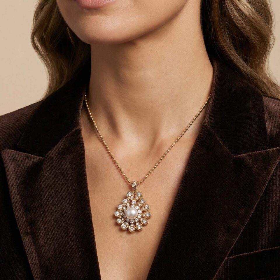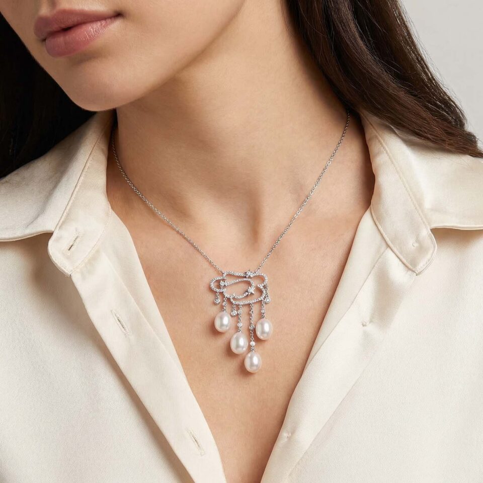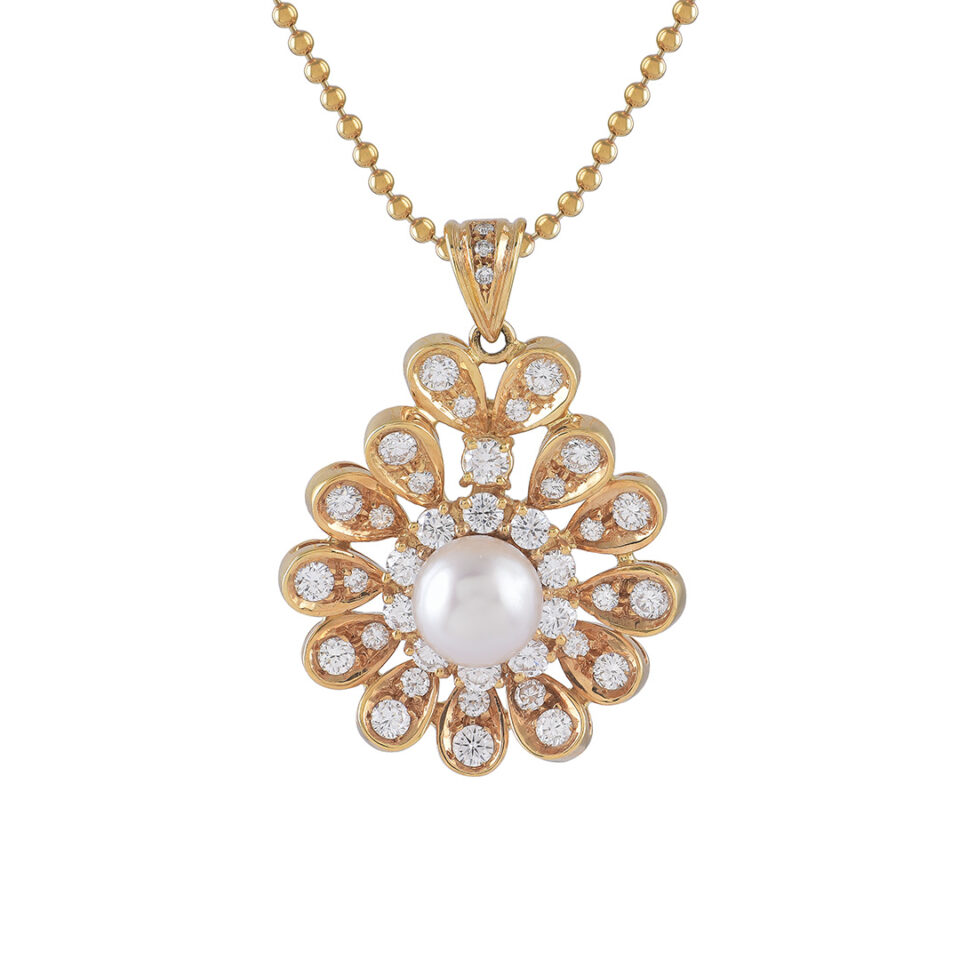 Diamond And Pearl Necklace of 18K Yellow Gold